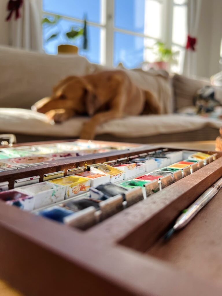 Die meiste Zeit verbringe ich in unserem Garten oder draußen mit unseren zwei Hunden. Wenn es aber bunt werden soll, ziehe ich mich zurück und widme mich meiner Acryl- und Aquarellmalerei.